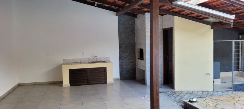 Área de festas externa ampla com churrasqueira, pia e banheiro.