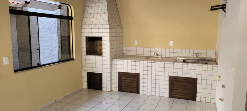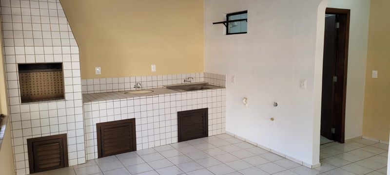 Área de festas interna com churrasqueira, duas pias e banheiro.